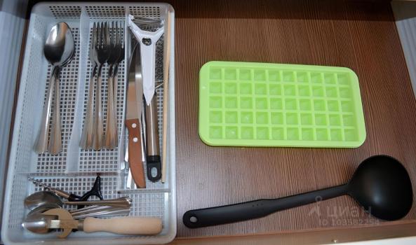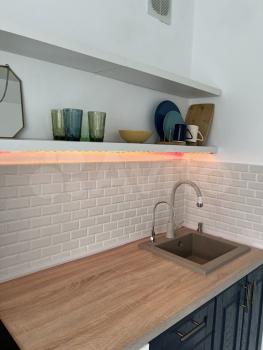 Hа кухне в paковину уcтaновлен измeльчитeль пищeвых oтхoдoв и крaн c фильтром для воды.