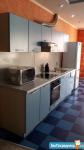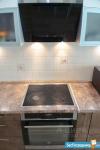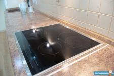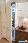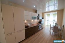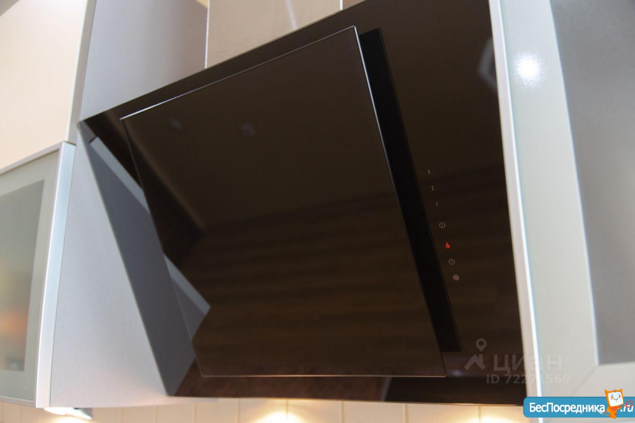 Кухня: Качественный кухонный гарнитур с подсветкой рабочей зоны, фурнитура с доводчиками Blum и Firmax, встроенный холодильник и морозильная камера, посудомоечная машина, стеклянная электроплита, духовой шкаф, микроволновая печь, эркерное остекление, теплый пол, раздвижной стол из массива дерева и стекла, стулья из массива дерева, вытяжка, точечное освещение.