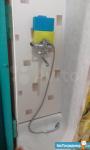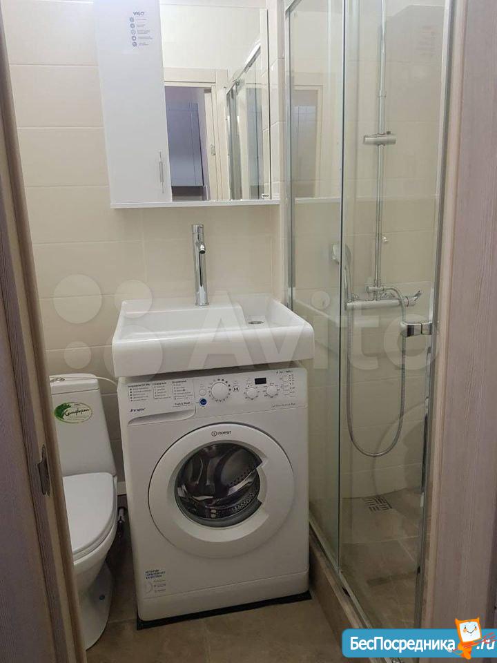 В ванной: душевая кабина, унитаз, раковина, стиральная машинка, полки.