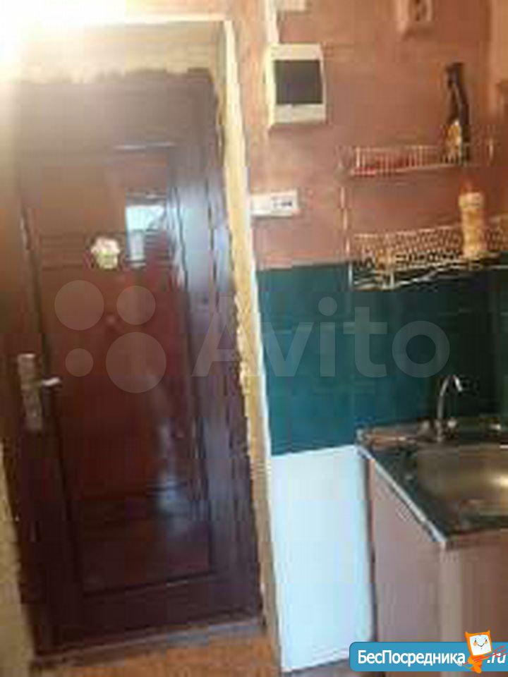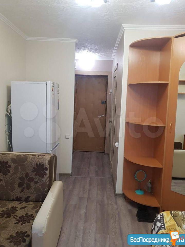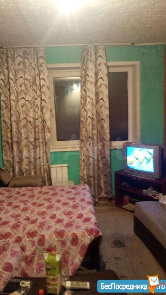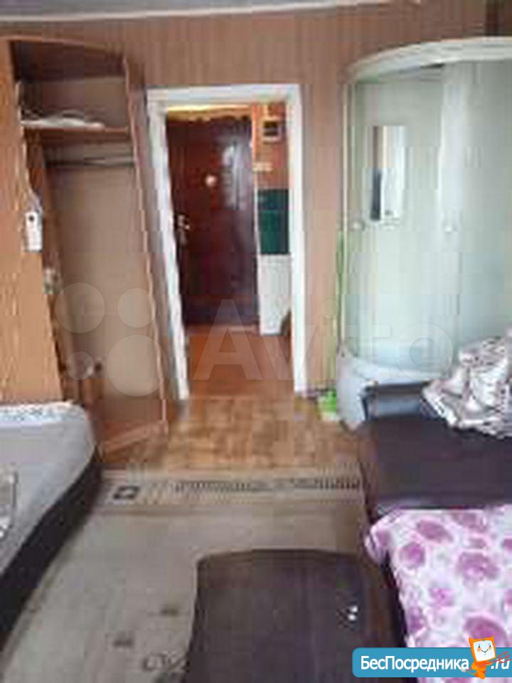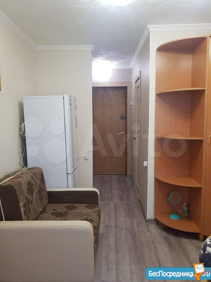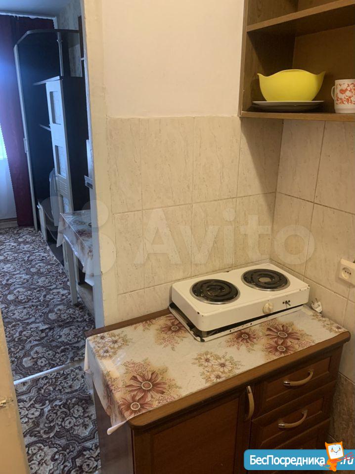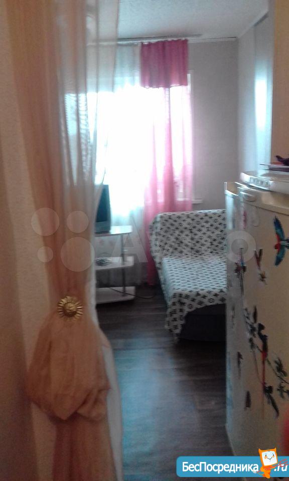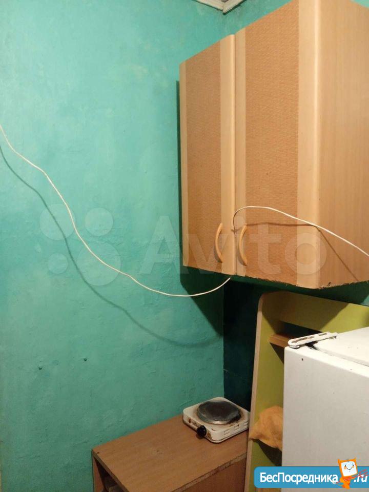 гостинка 18кв 5/5 двух ярусный диван, телевизо, хол-к, душ-поддон, туалет раковина совместно. На фото всё видно. Рядом магазины дет сады школа дет пол-ка (вода свет оплачивать не надо все входит в стоимость)