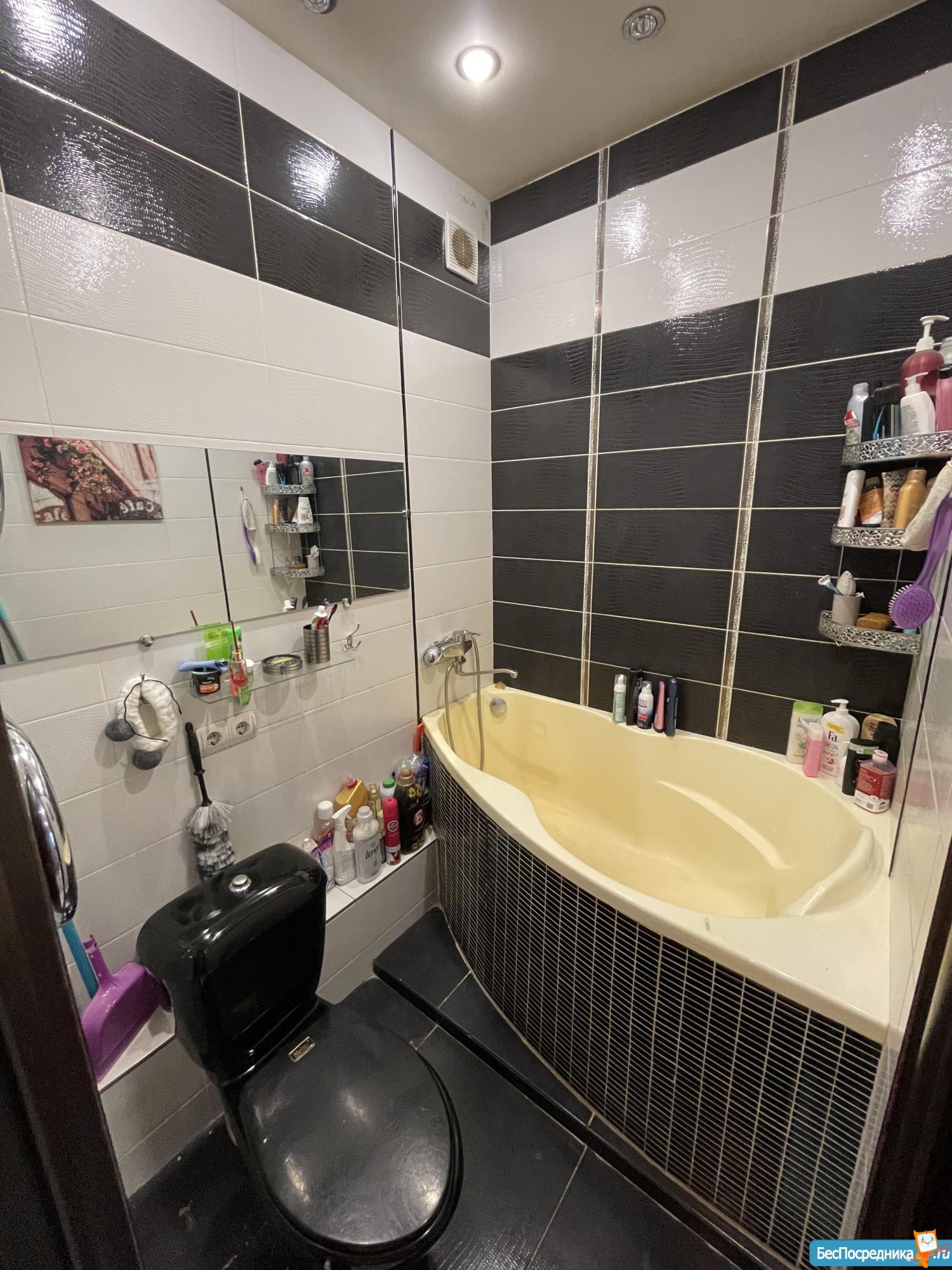 Санузел совмещенный, оформлен в современном стиле с яркими акцентами.