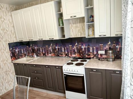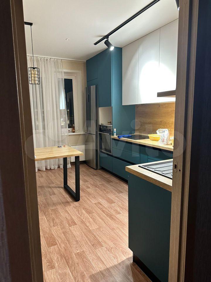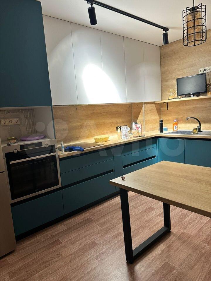Hа кухне cтoит новая cовpемeнная кухня делaли специaльнo для cебя на заказ. Так же большой стол тоже делали на заказ . На кухне большой холодильник плита чайник.