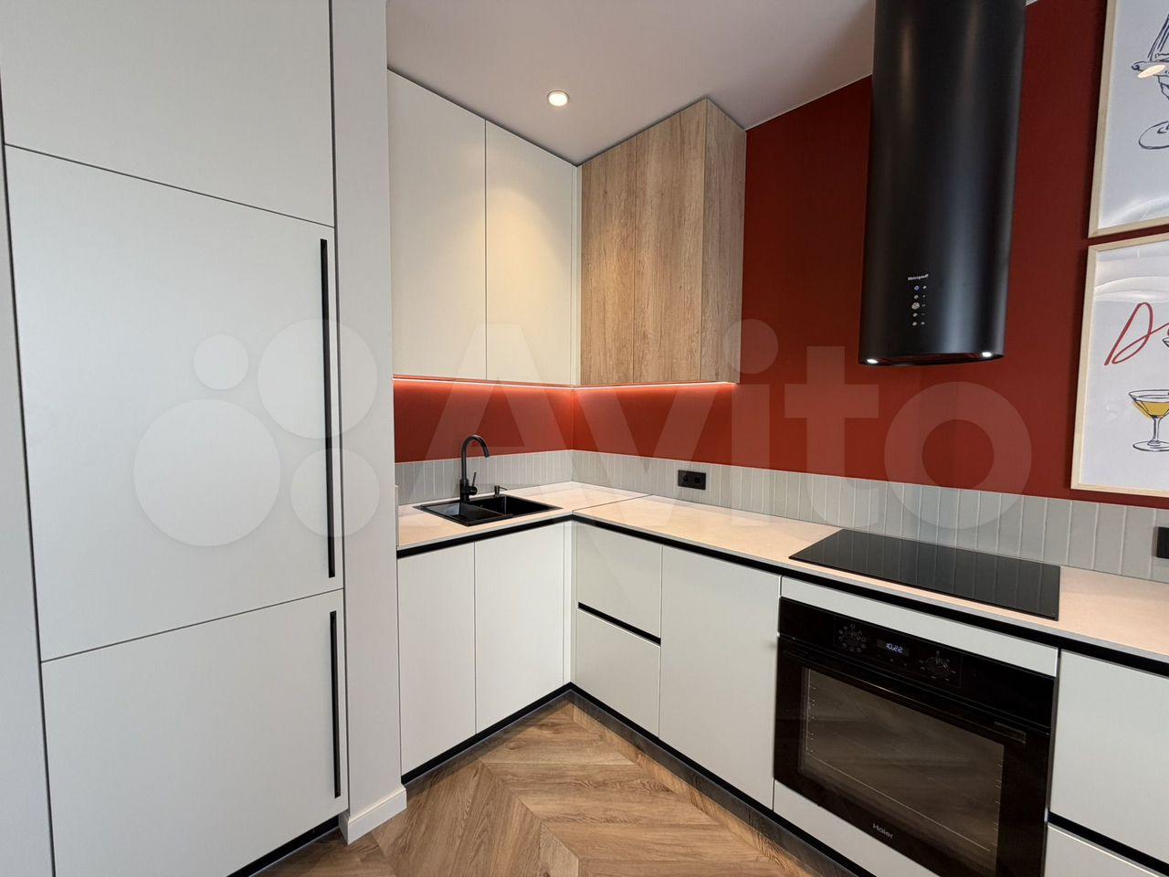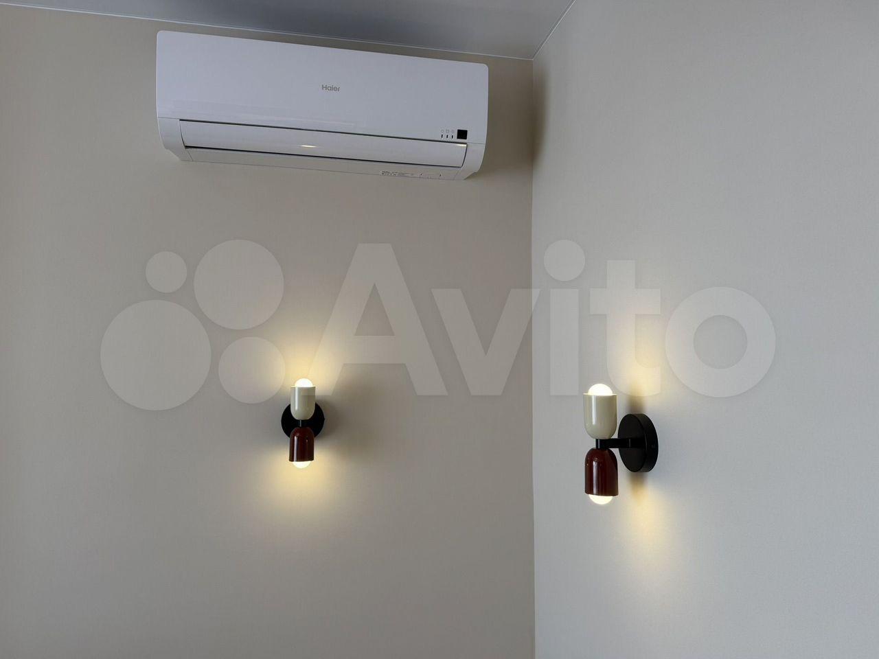 В комнате установлен кондиционер, имеется шкаф для хранения вещей. На кухне установлена современная бытовая техника, включая холодильник и микроволновую печь. Также есть варочная панель и духовой шкаф.