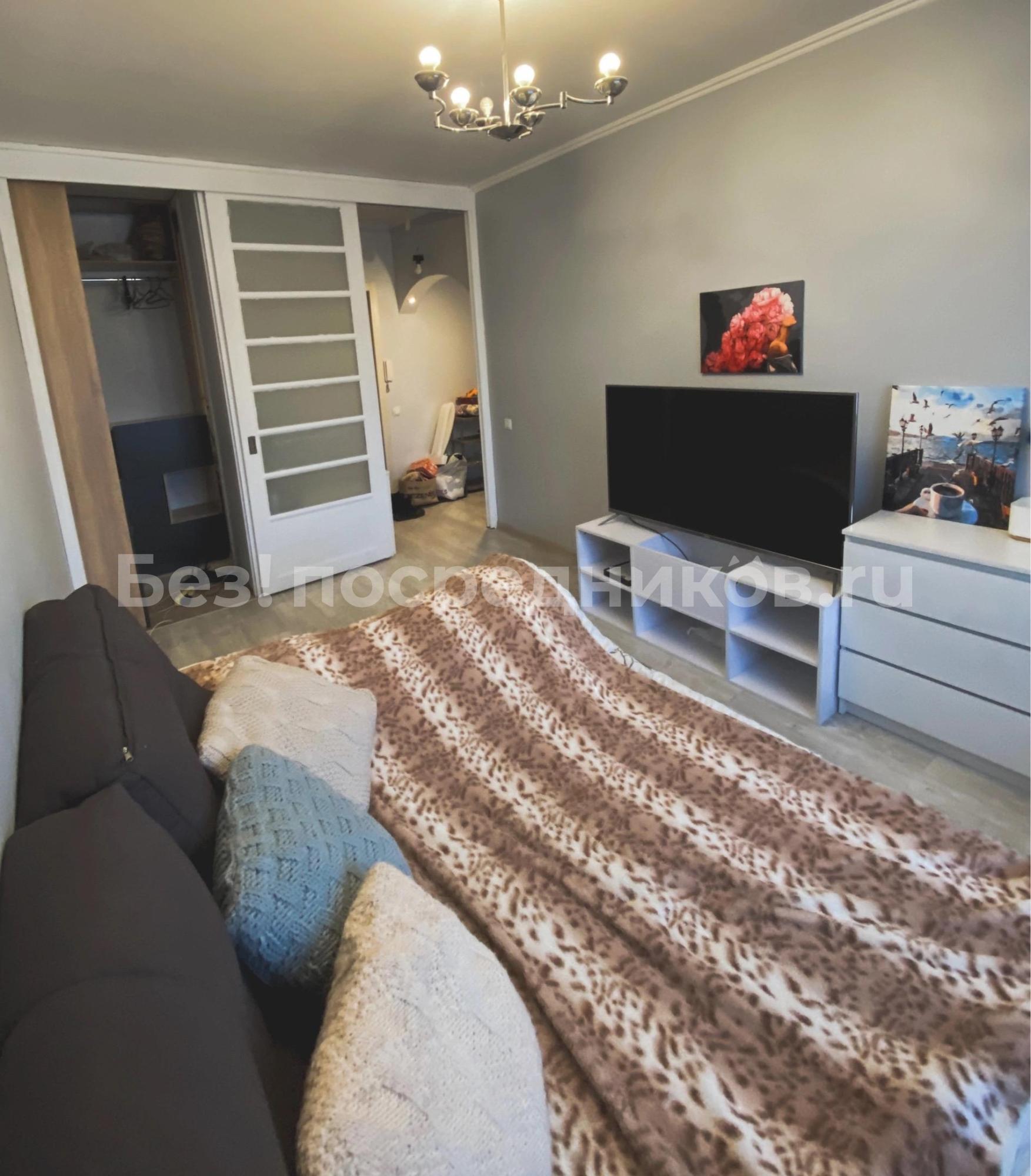 Квартира с косметическим ремонтом, светлая и просторная. Жилая площадь составляет 25 м², кухня — 9 м². В квартире есть необходимая бытовая техника: холодильник, стиральная машина и плита. Из мебели — шкафы и диван.