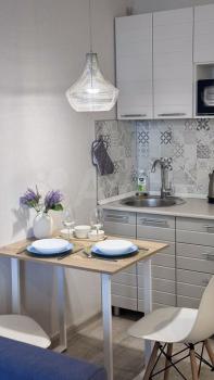 Кухня оборудована современной техникой, включая плиту и микроволновую печь, а также обеденным столом с удобными стульями. Санузел совмещенный, выполнен в современном стиле с качественной отделкой.