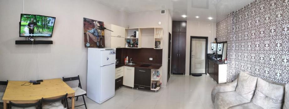 Полностью готовая для проживания квартира-студия, с хорошим ремонтом, всей необходимой мебелью и техникой (смарт телевизор, кухонная плита, холодильник, стиральная машина, бойлер, вайфай, утюг) + красивый вид на Енисей и 4й мост.