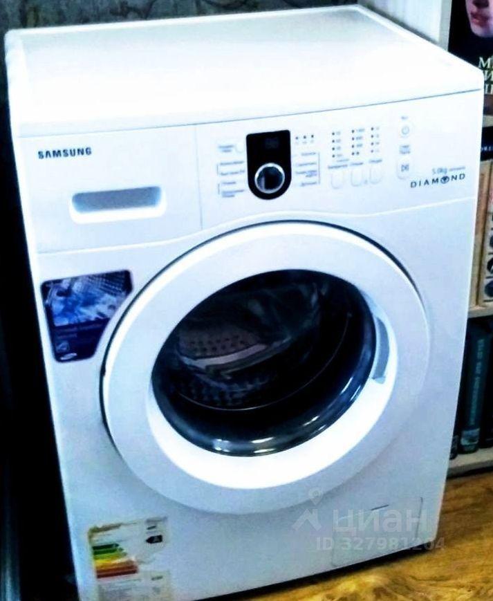 В комнате стиральная машинка, плитка, микроволновка, чайник, холодильник.