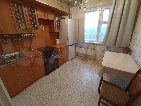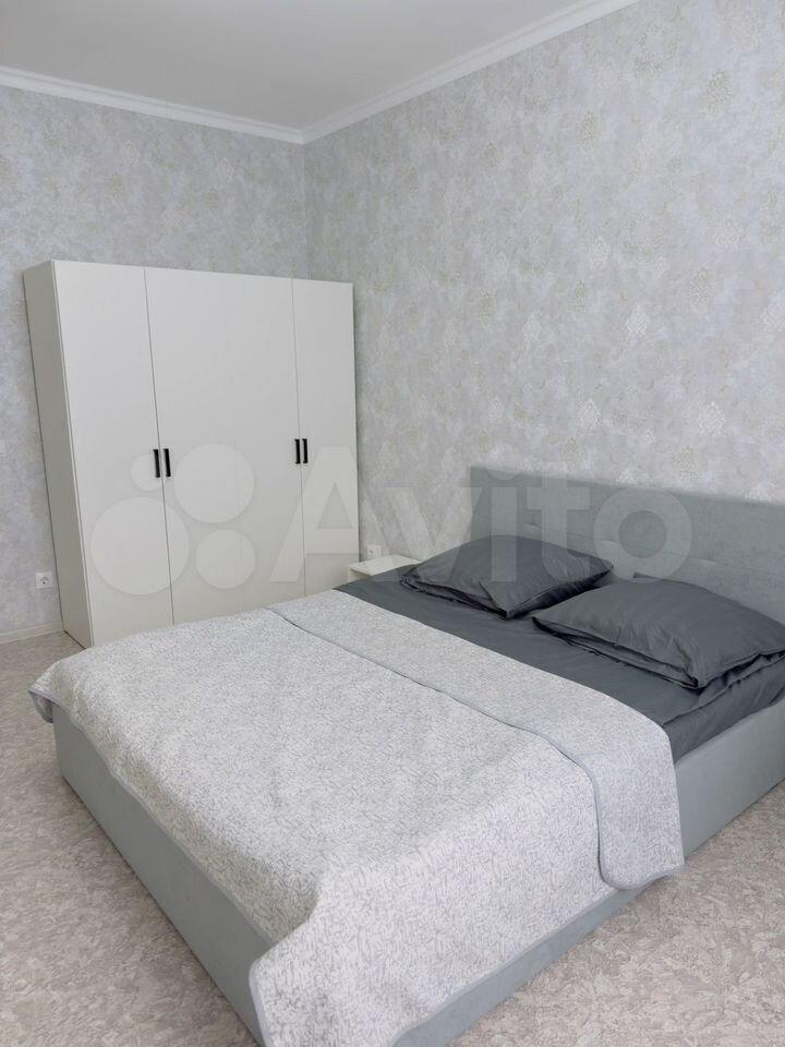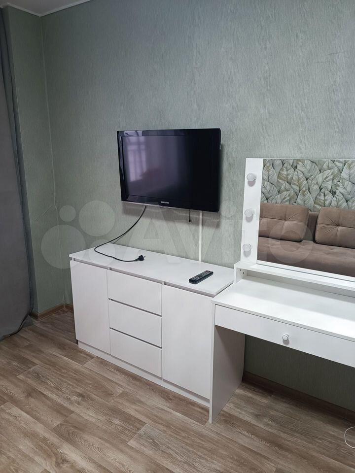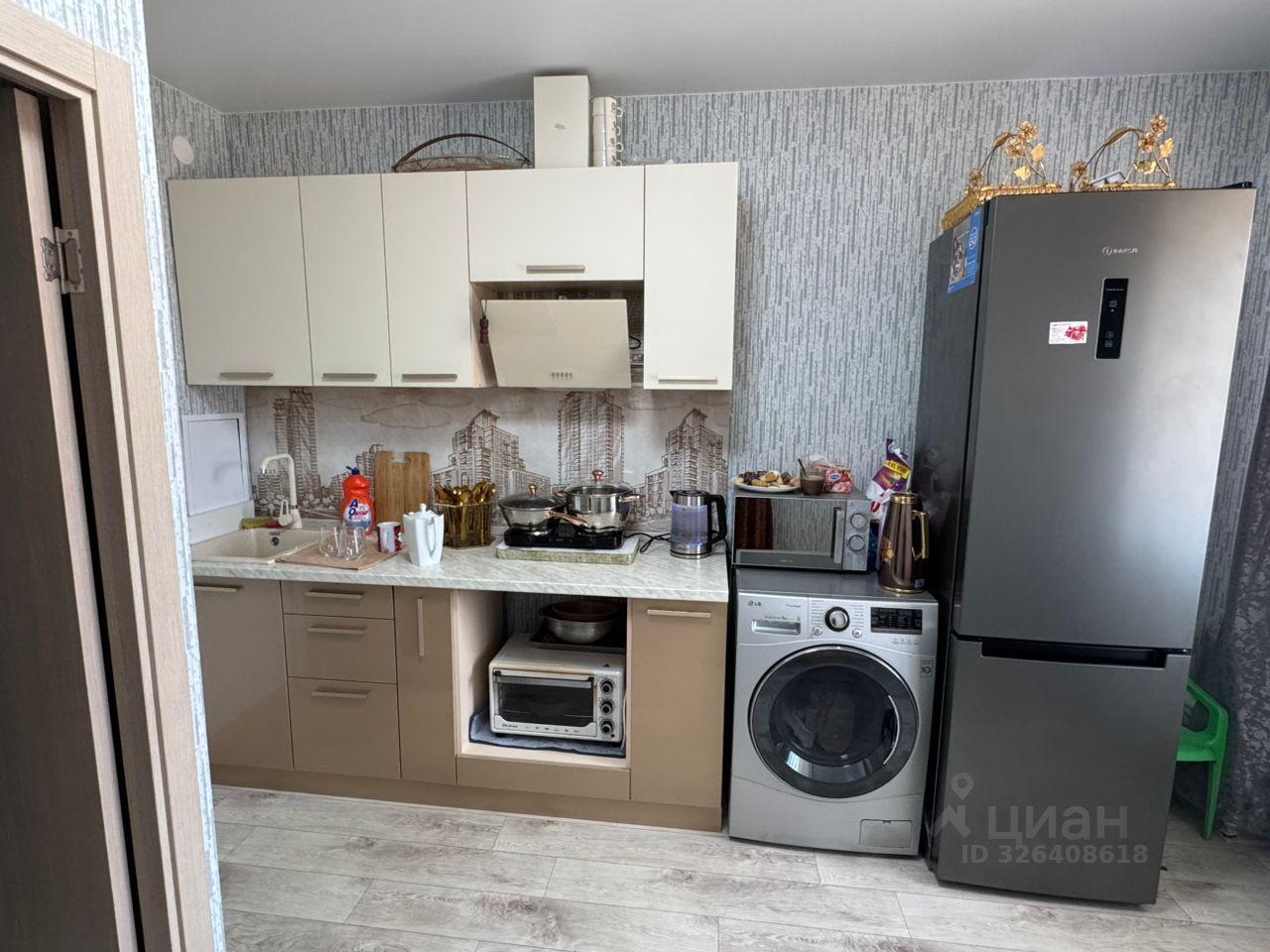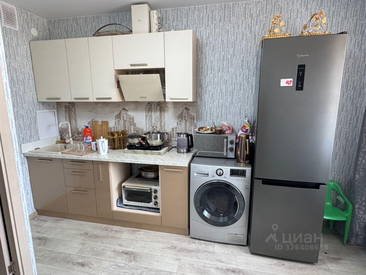 Просторная кухня оборудована необходимой бытовой техникой, включая холодильник и стиральную машину. В комнате установлен вместительный шкаф-купе.